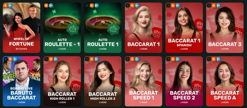 UK players get to spin American, European and Lucky Roulette from Belatra or classic and live wheels from BetGames, plus auto and Spanish tables from Live88. Prefer live shows? Check out Evolution’s Crazy Time, Red Baron or BetGames favourites like Lucky 5, Bet on Poker and War of Bets.