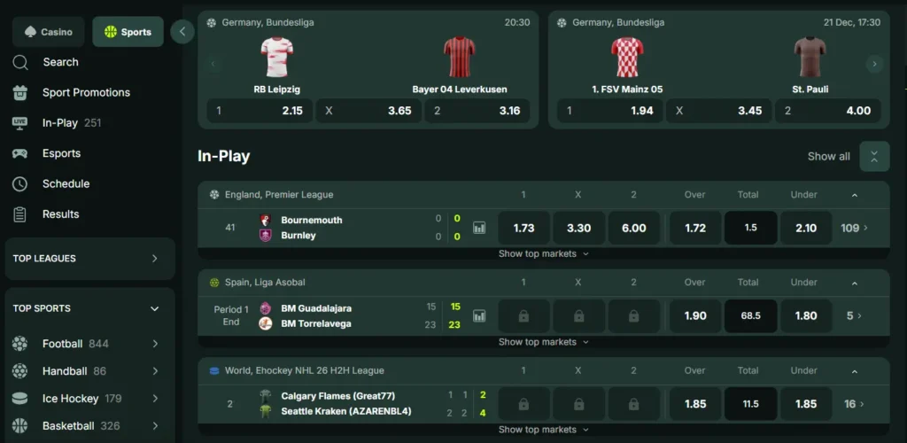 | Popular Leagues | Premier League, Champions League, NBA, ATP/WTA Tours |